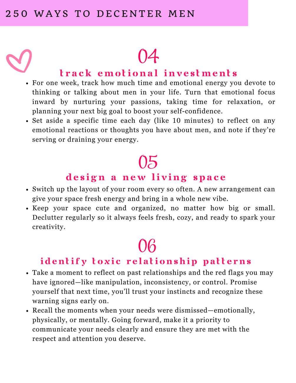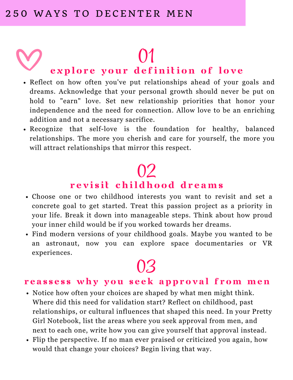 This book is about putting yourself first and no longer making men the center of your world. Decentering men isn't about rejecting or resenting them...it's about prioritizing your own wellbeing. You will receive an actionable guide of 250 ways to decenter men.